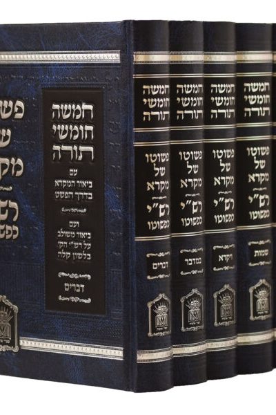 פשוטו של מקרא – רש"י כפשוטו סט ה' כרכים פורמט גדול. חמישה חומשי תורה 'פשוטו של מקרא – רש"י כפשוטו' בהוצאה חדשה, בדפוס חדש ובאותיות מאירות עניים. לחומש 3 סוגי ביאורים: 'פשוטו של מקרא' – מבאר את הפסוקים בדרך הפשט על פי מפרשי התורה ראשונים ואחרונים, ונוסף על כך ביאור משולב על רש"י בשפה קלה. 'מקרא מלא' – ביאור משולב בפסוקים ע"פ ביאור פשוטו של מקרא. רש"י כפשוטו – ביאור משולב על רש"י בלשון קלה ושווה לכל נפש.